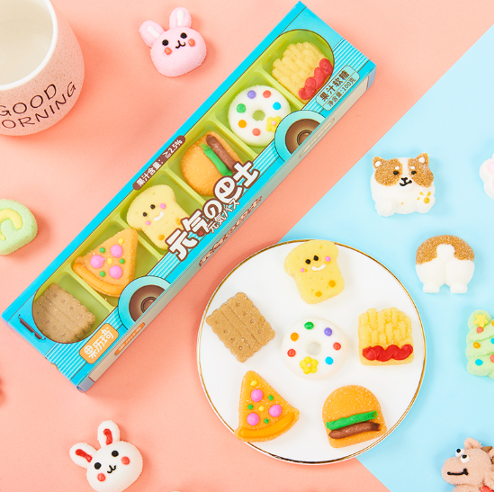Deliziose Caramelle Gommose Miste a forma di mini cibi: pizza, hamburger, patatine, biscotti e toast. Morbide, colorate e cosparse di zucchero, sono perfette come snack divertente, idee regalo, party bag o contenuti social. Un assortimento giocoso e irresistibile che piace a bambini e adulti.